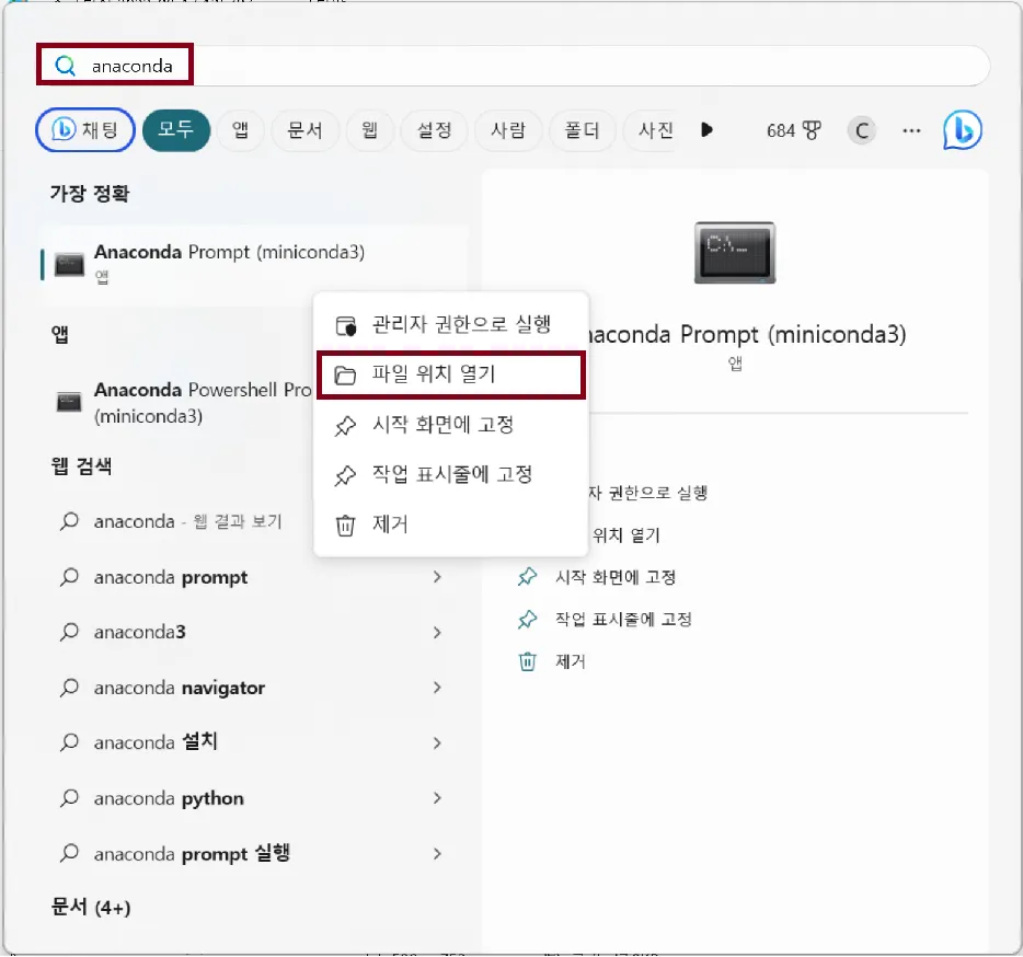 아까 복사했던 경로의 위치를 확인해 줍니다. 만약 복사 하지 않았다면 아래와 같이 아나콘다의 위치 확인해 줍니다.